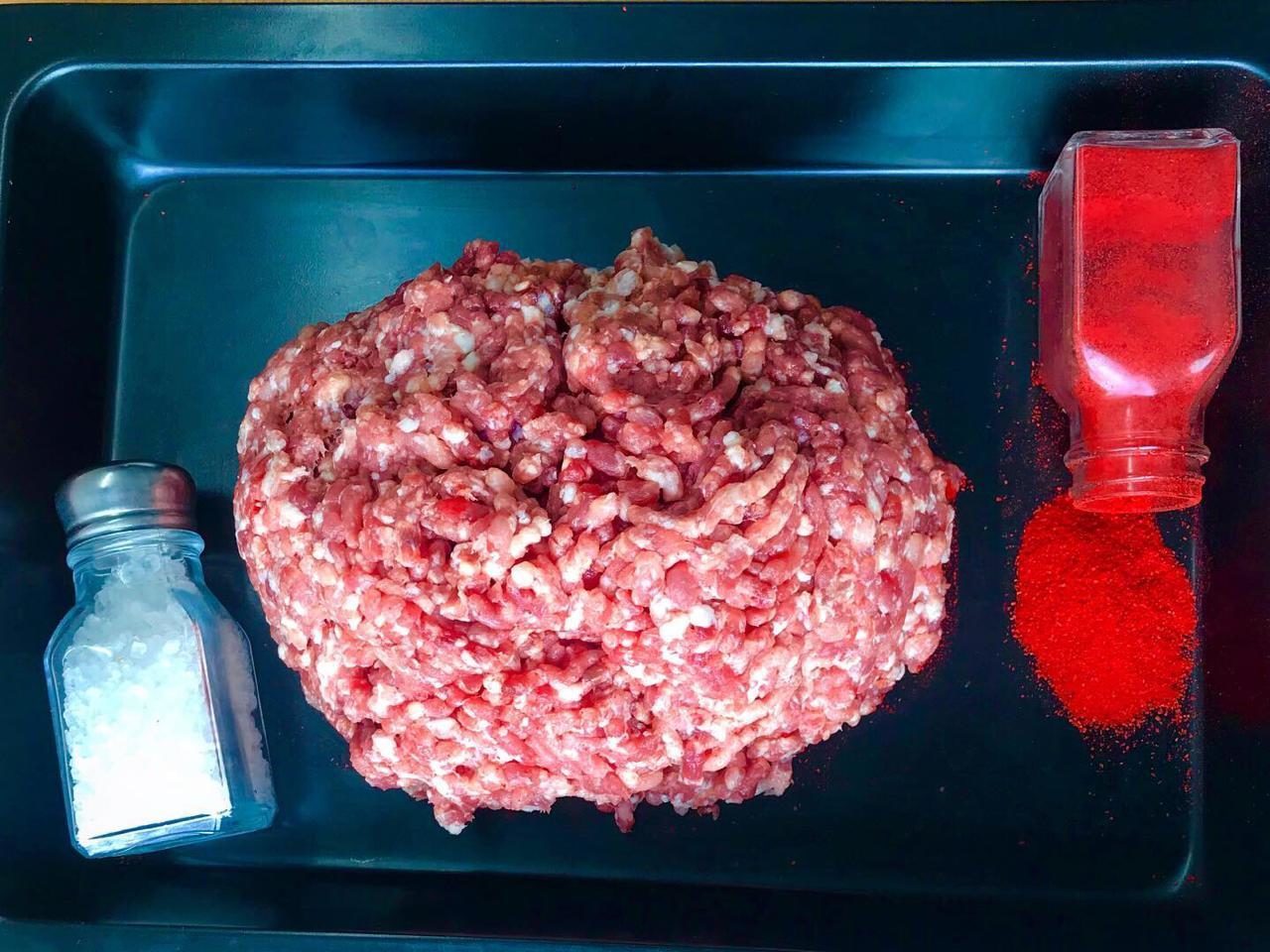 Для фарша использовано куриное филе. Из фарша получаются вкусные люля, котлеты. В фарш добавлены следующие специи: лук, перец, соль, паприка, укроп, петрушка. Фарш хорошо вымешан и выбит.